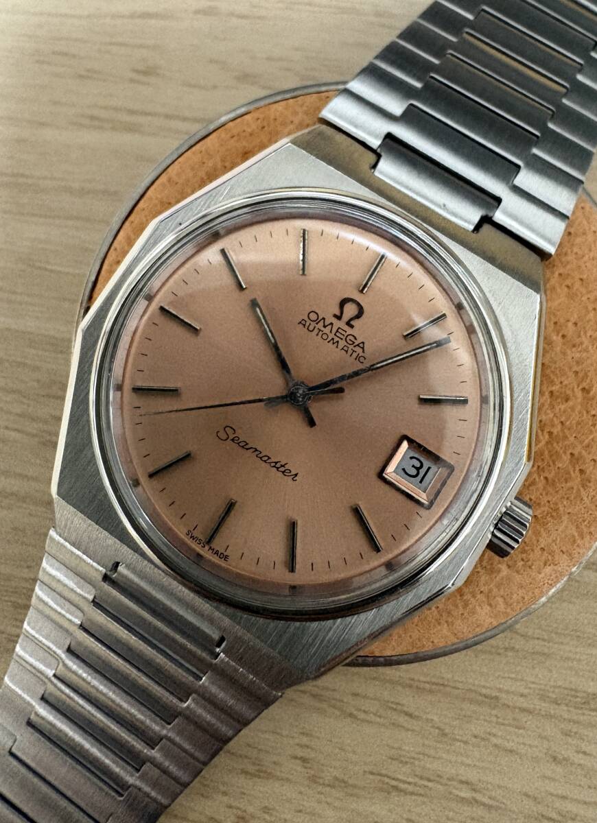 シーマスターのカラーダイヤルシリーズでは結構珍しい、オクタゴンケース&サーモンピンク文字盤モデルです。